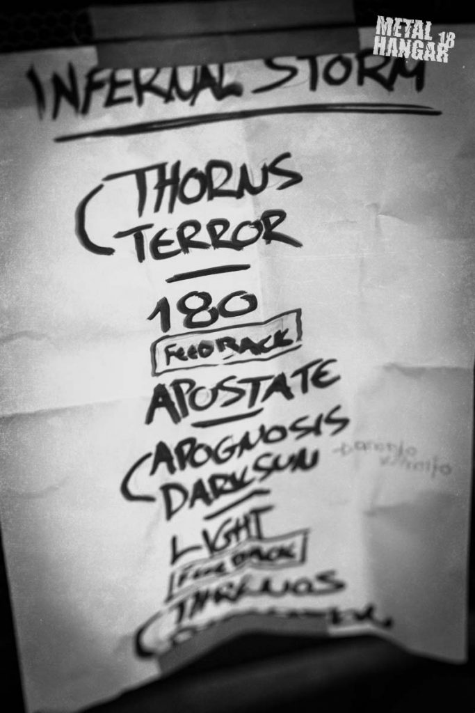 Всички фенове тръпнеха в очакване за началото на събитието. Клубът сравнително от рано се напълни и като първи на сцената излязоха INFERNAL STORM. Групата започна своето представяне с богата палитра от звуци и светлини. Мощно, изригващо начало и много емоции заляха аудиторията. Гръцките музиканти бяха пълни с енергия и гръмово звучене, което караше публиката да аплодира и скандира. Мощно и ожесточено момчетата от INFERNAL STORM забиваха и разпростираха своя заряд и показваха как трябва да звучи блек метъла. Едно след друго парчетата им се изливаха като грамотевичен заряд. Присъстващите бързо навлязоха в подходящото настроение за тази вечер, която обещаваше да бъде силна и запомняща се. Бластбийтовете се редяха като торпедни снаряди един след друг, ескалираха емоциите до висока степен. Суров, твърд блек се изливаше на талази от сцената, приковавайки вниманието ни и карайки ни да очкаваме с нетърпение следвашата песен. Ясна и добре структурирана хармония огласяваше залата, всяка нота бе точно на място, подредена в стройна редица от звук и усет за професионално изпълнена музика. Последваха дълги арпежи и акорди и последно изпъление, което остави публиката заредена и подготвена за следващата група.