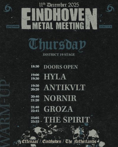 Тази година, пръв се разпродаде подгряващият концерт в четвъртък. На него ще свирят GROZA, The Spirit, ANTE-INFERNO, Antikvlt и Hyla. Наистина смразяващо начало на метъл празника Eindhoven Metal Meeting 2025!