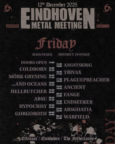 Фестивалът, празнат хиляди фенове, от много банди и повечето специализирани медии, за най-силният такъв екстремен ивент на закрито в Европа, Eindhoven Metal Meeting започва утре, 11-и декември с подгряващо ден, а същинските фестивални дни са петък и събота, съответно 12-ти и 13-и декември!