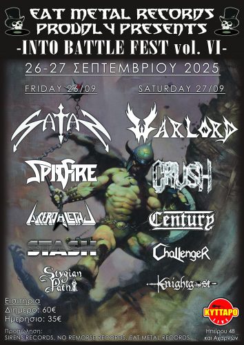 Шестото издание на култовия хеви метъл фестивал INTO BATTLE FESTIVAL, организиран от лейбъла EAT METAL RECORDS стартира днес, 26-и септември, продължава два дена и има и бонус концерт -афтърпарти в неделя 28-и! Събитията се провеждат в клуб KYTTARO в Атина и привличат фенове от цял свят с добре подбрания лайн-ъп само за маниаци на жанра.
