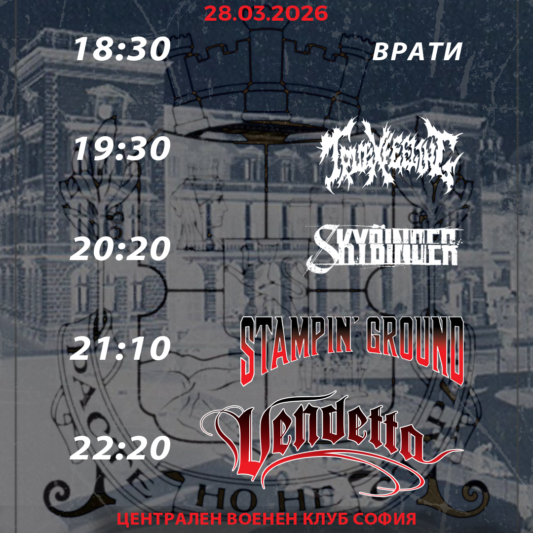 Концертът на Vendetta по повод 15 години „Време Разделно“ със специални гости Stampin’ Ground и с участието на Skybinder и TRUExFEELING е утре-събота, 28-и март в Централен Военен клуб, София!