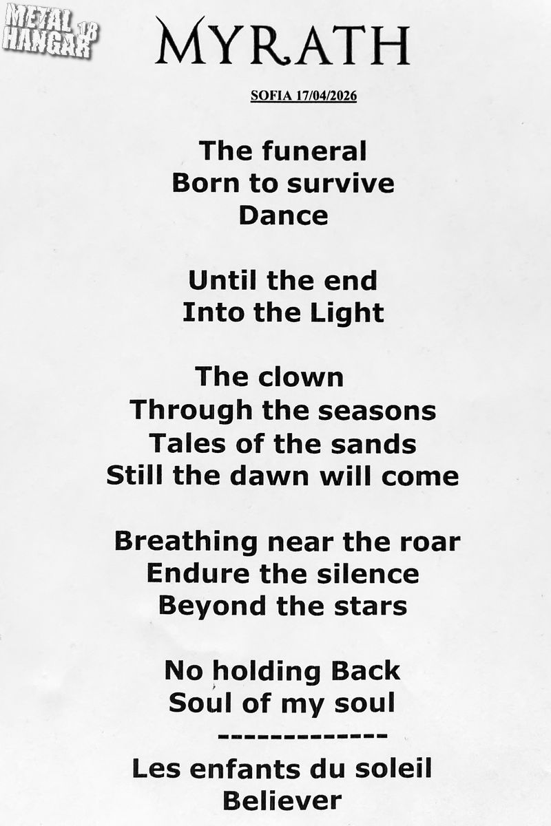 След тях на сцената излязоха MYRATH, които превърнаха концерта в истинско кинематографично преживяване – мощно, мелодично и заредено с екзотична атмосфера. Групата звучеше стегнато и мащабно, а съчетанието от прогресивен метъл, ориенталски мотиви и модерни оркестрации направи шоуто им разнообразно. Сетлистът обхвана по-новите им композиции, но не пропуснаха и утвърдени любими песни.