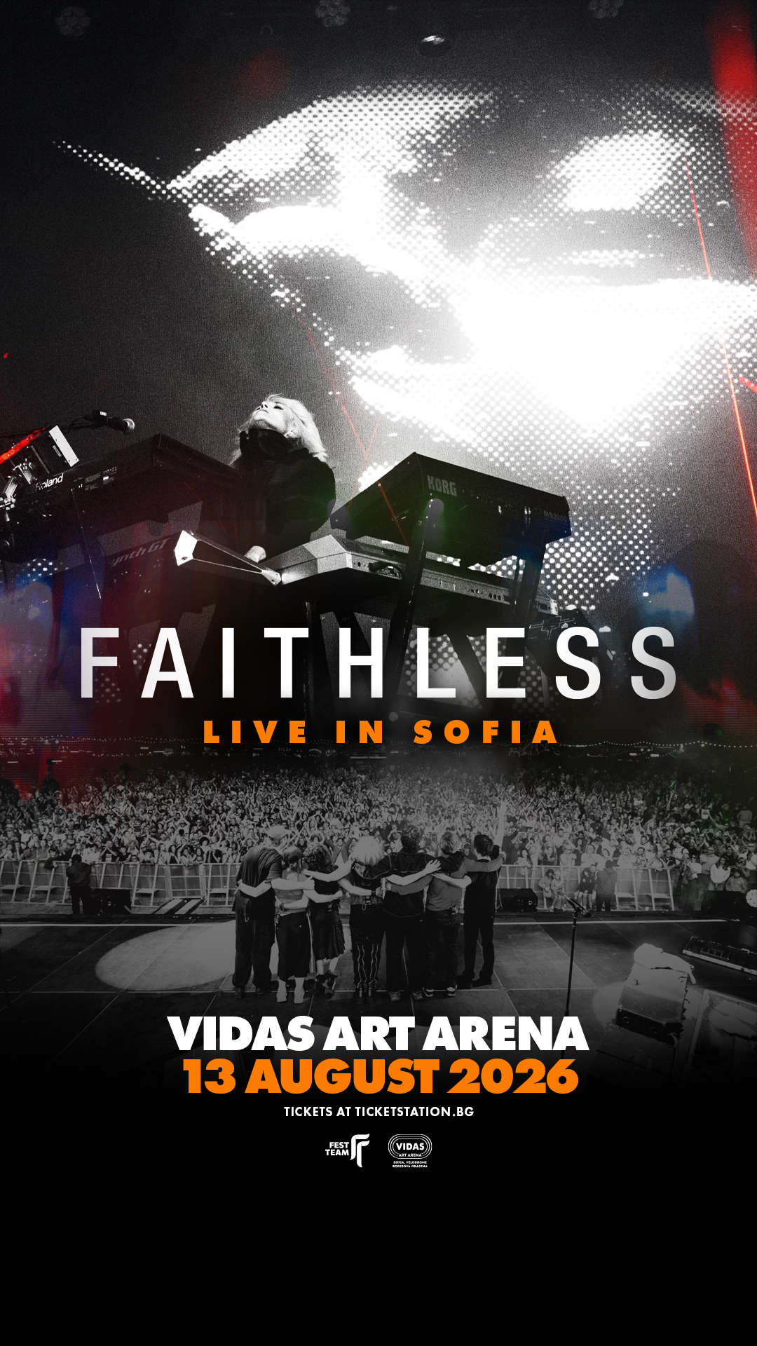 България става част от нов цикъл в историята на легендарните Faithless с концерт в София това лято. Insomnia и God is a DJ ще прозвучат на живо под открито небе, когато една от най-влиятелните формации в електронната музика ще се срещне с българската публика в разгара на лятото на 13 август на Vidas Art Arena. Билетите за събитието влизат в продажба на днес, 10 февруари в 11:00 ч. в мрежата на Ticket Station на цени от 35 евро за Early Bird, 88 евро за Golden Circle и 150 евро за VIP.