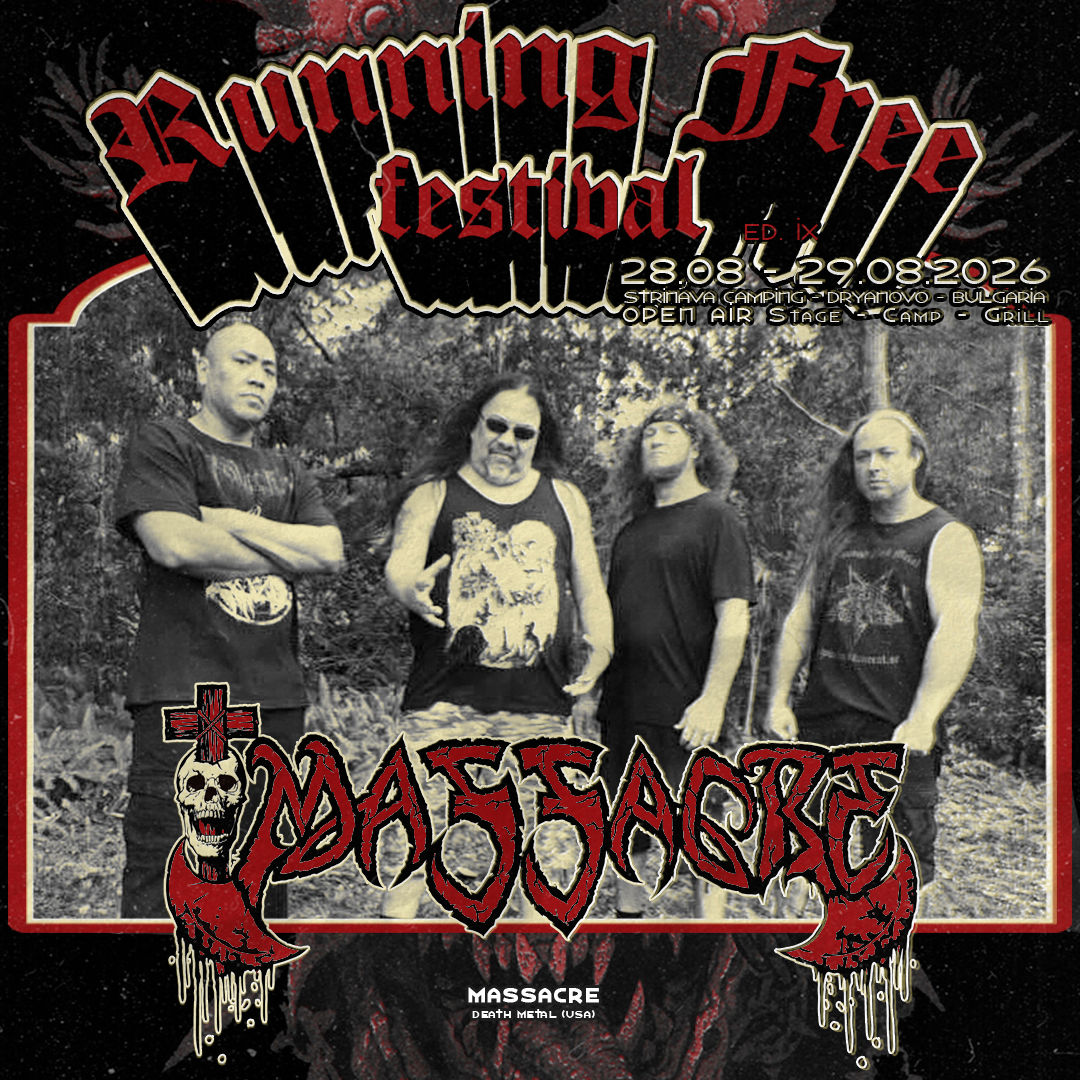 Дет метъл легендите MASSACRE ще разбият сцената на Running Free Festival със своя емблематичен, суров и агресивен звук, който помогна да се оформи жанрът в края на 80-те и началото на 90-те години.