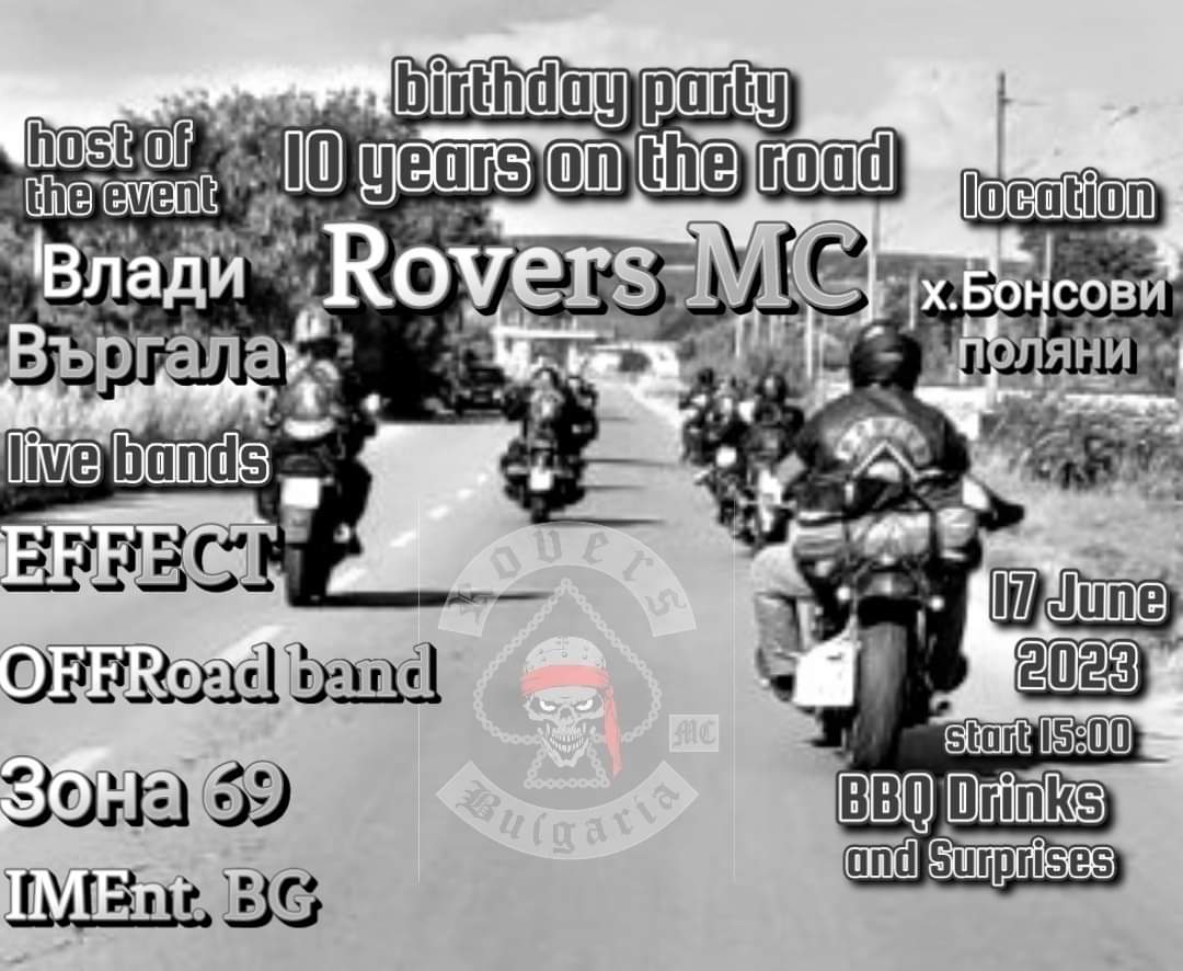 На 17 – ти юни OFFRoad ще забият на хижа Бонсови поляни, където столичният мото клуб Rovers MC ще празнува десет години от своето създаване. През годините момчетата от клуба и групата неведнъж са си подавали ръка за различни проекти и са изградили голямо приятелство и взаимно уважение и респект! И при наличието на такъв повод, като предстоящия юбилей, мотоциклетистите са решили да си направят подарък, а и на цялата аудитория в мото и рок средите, като поканят OFFRoad да се върнат на сцената, именно за техния рожден ден.