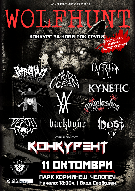 В събота – 11 октомври 2025 г. – парк “Корминеш” край Челопеч ще се превърне в епицентър на българската рок и метъл сцена. Първото издание на конкурса WOLF HUNT ще събере на едно място 10 нови български банди, които ще представят своята авторска музика в стремеж да покорят първото място, а гост-изпълнител са ветераните от Конкурент. Фестивалът е с вход свободен и обещава да предложи не просто музикална надпревара, а истинско музикално приключение сред природата.